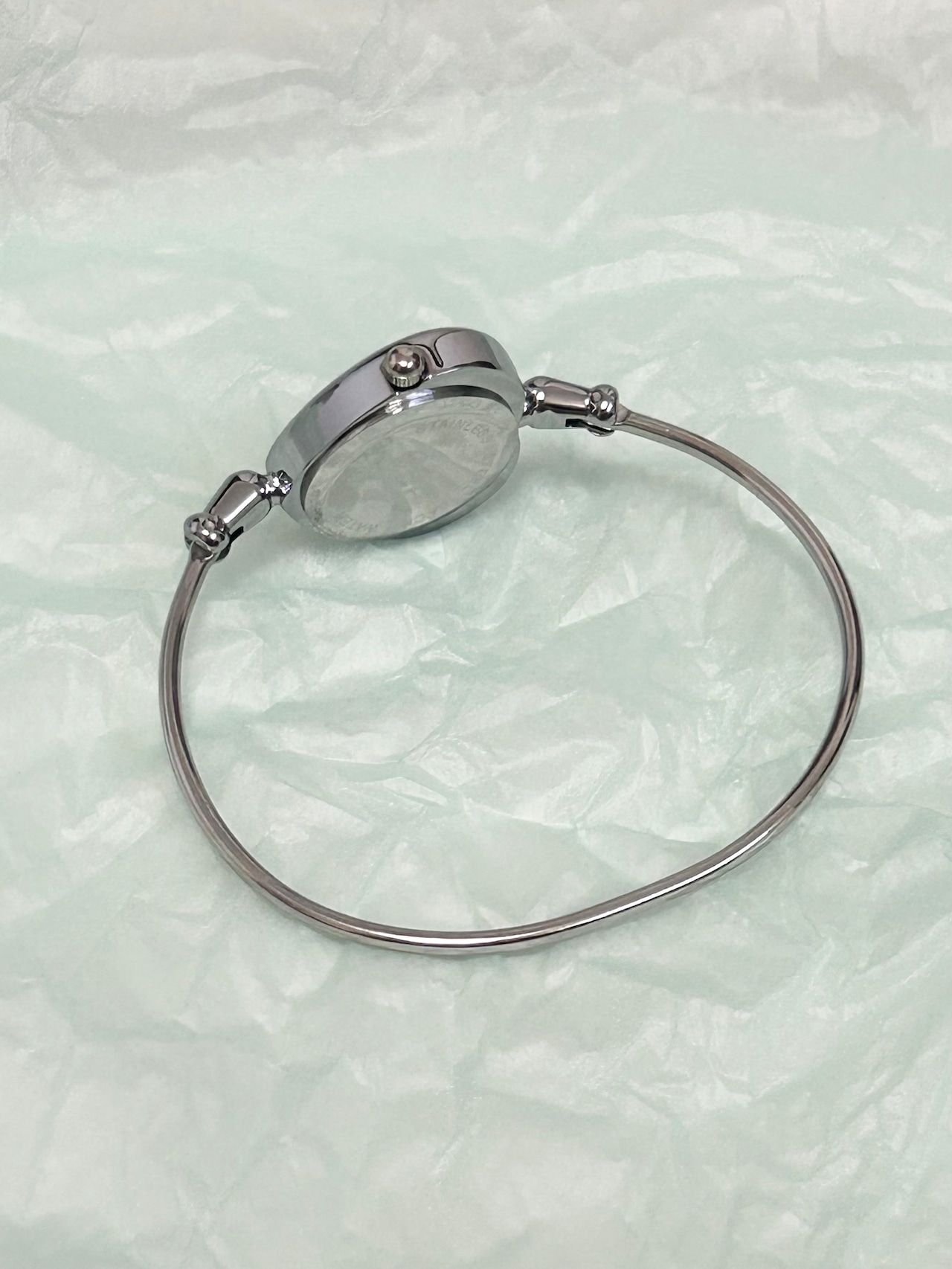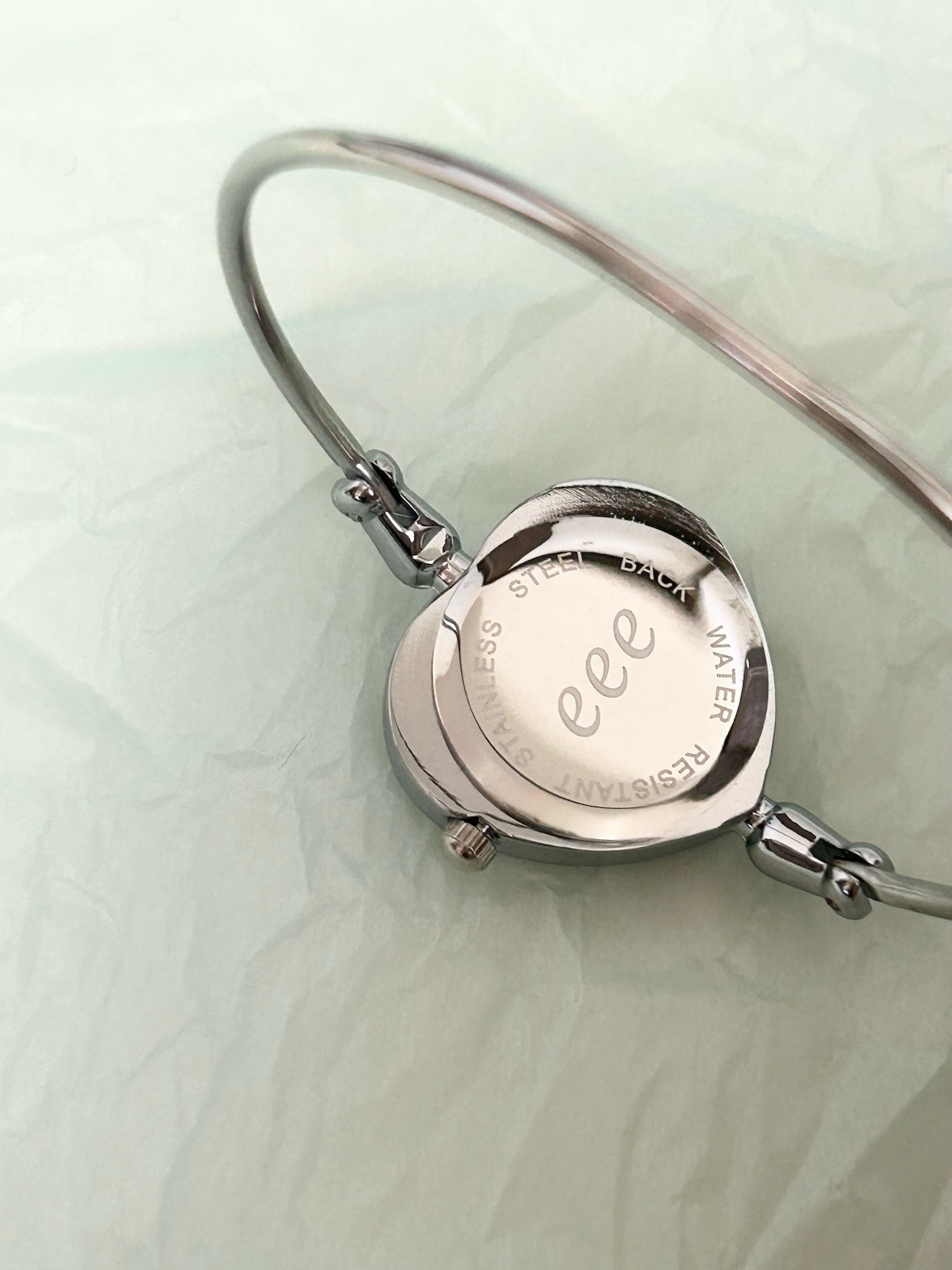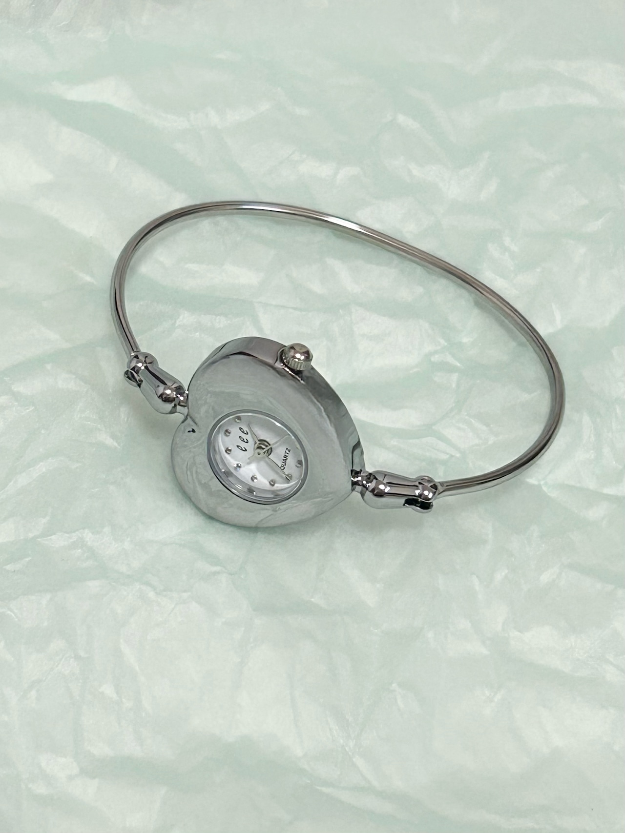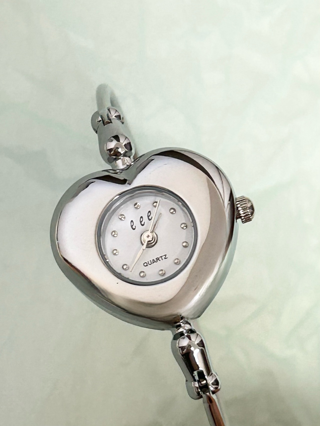ユニークなハート型の時計はガーリーな印象で、コーデのポイントにもぴったりです。